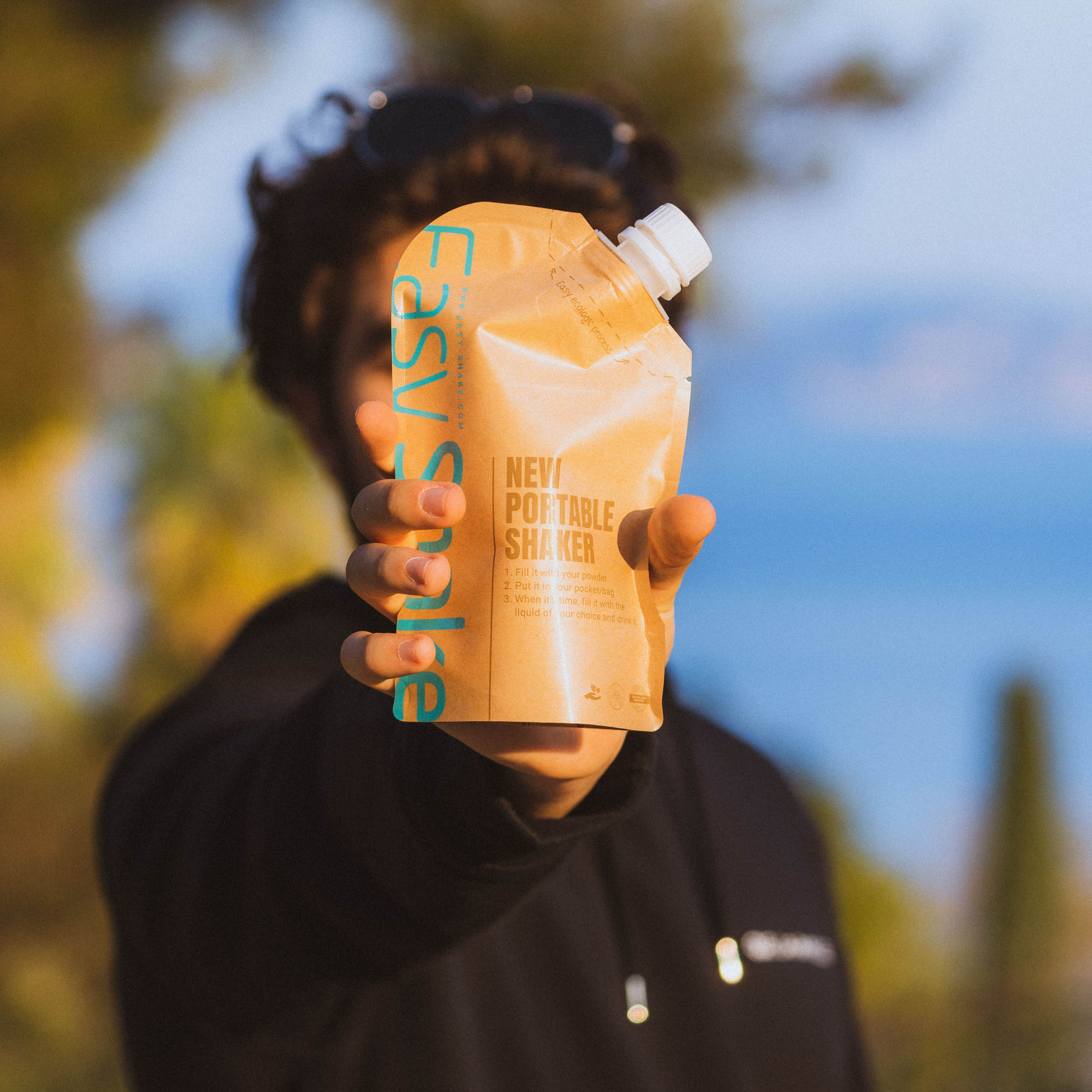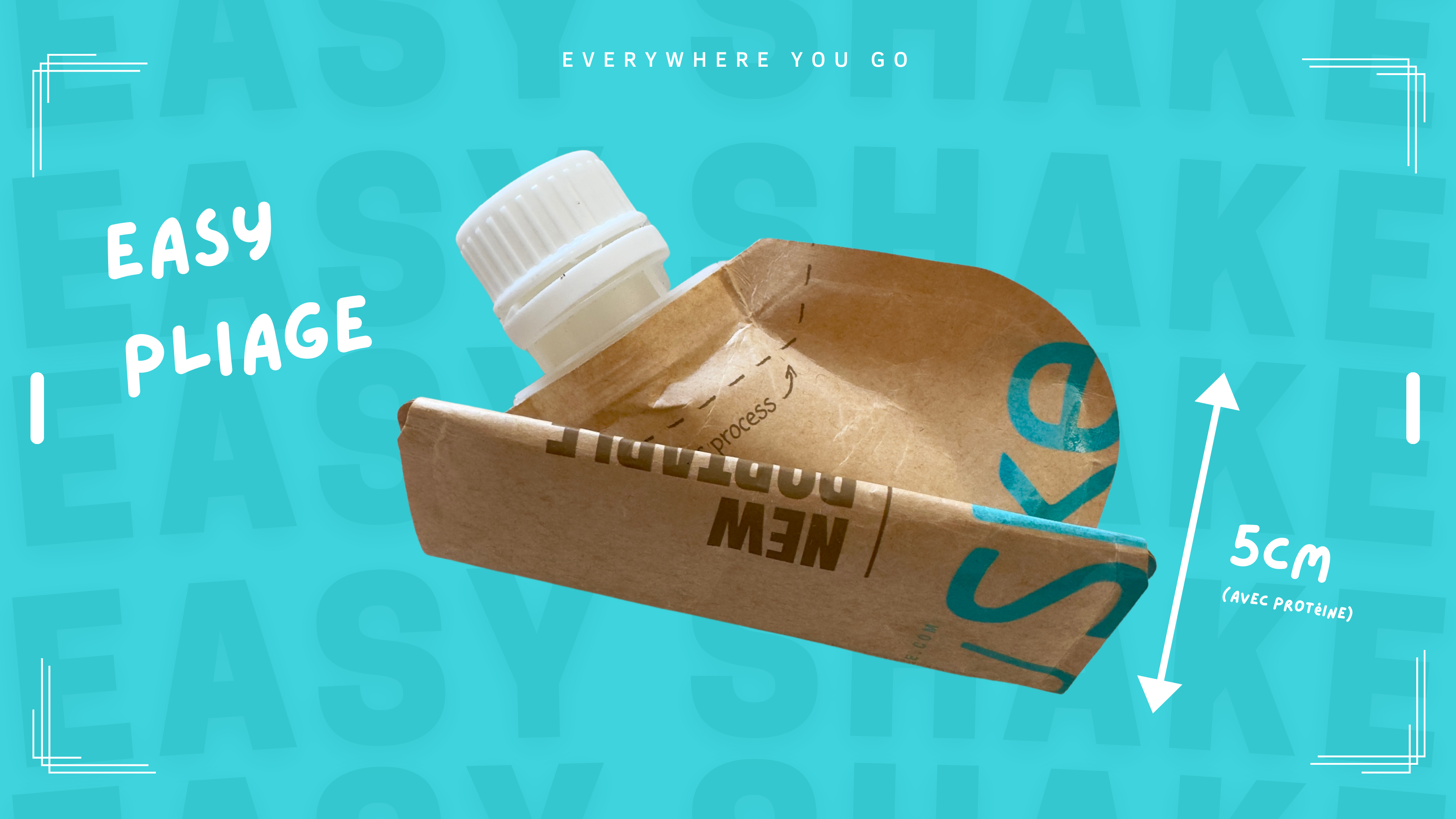 Après avoir pré-rempli votre EasyShake avec vos compléments alimentaires, il suffit de le plier pour pouvoir le ranger n’importe où.