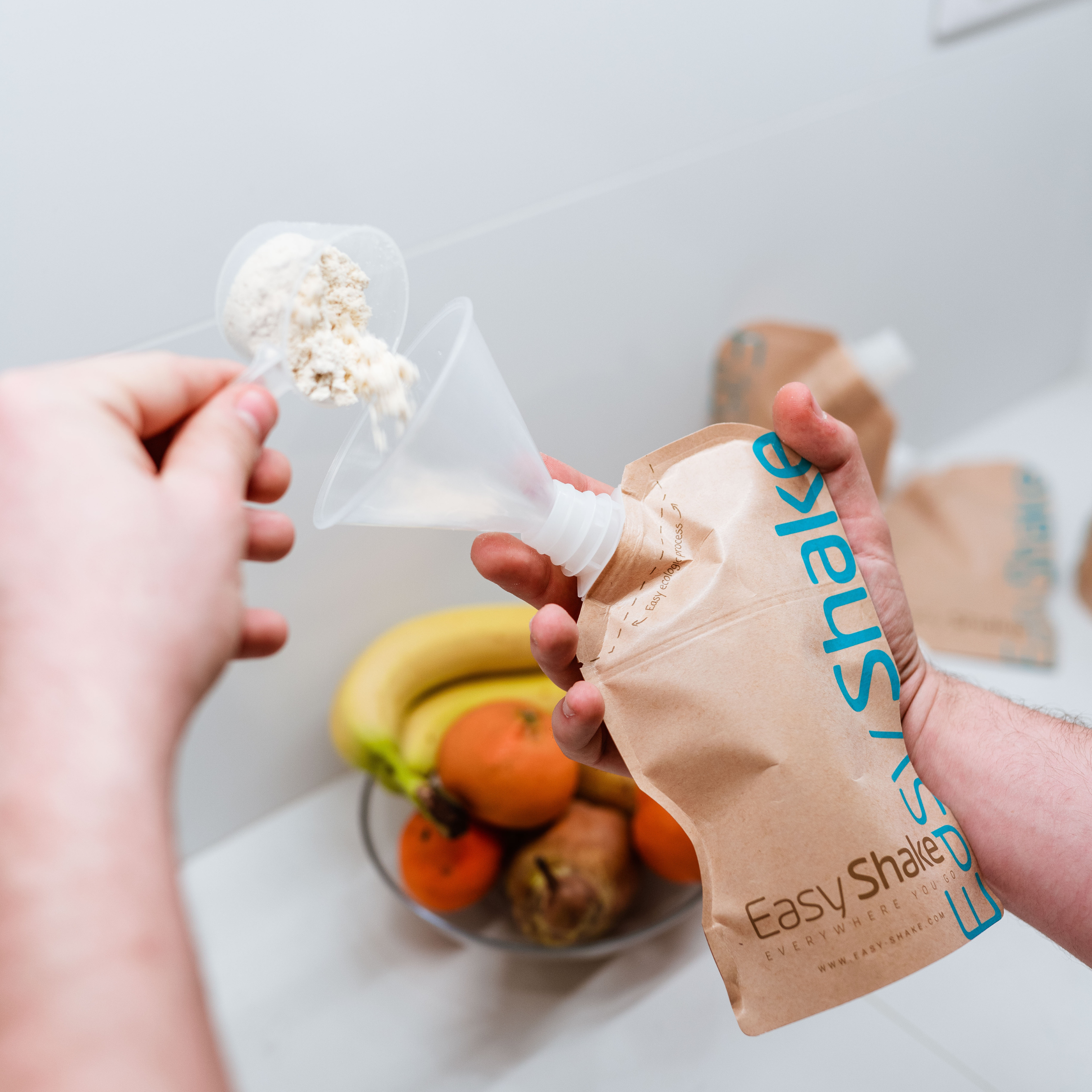 Chaque commande est accompagnée d'un entonnoir en carton recyclé. Cet outil est spécialement conçu pour faciliter le pré-remplissage de vos EasyShakes avec vos poudres. Voici comment l'utiliser :